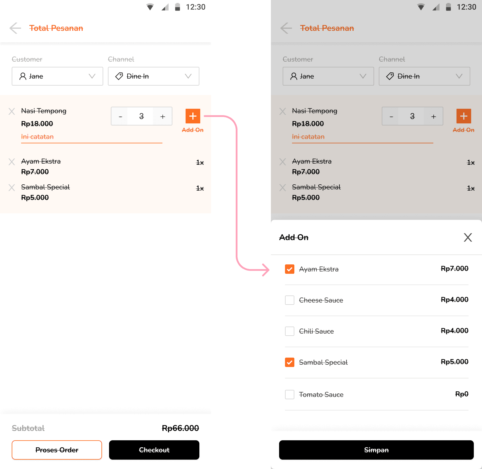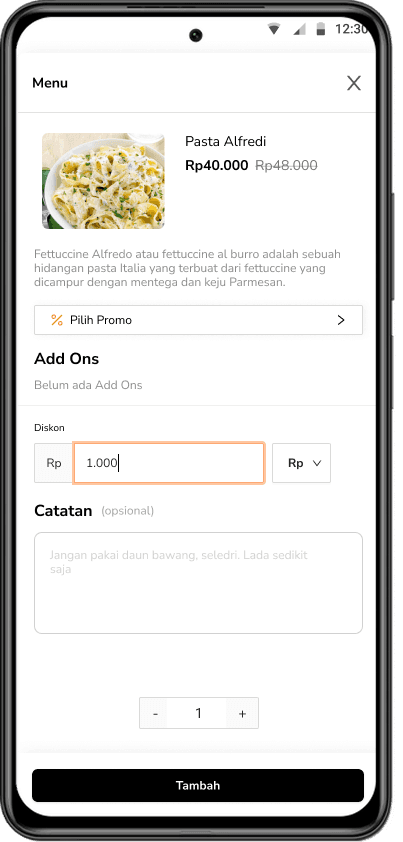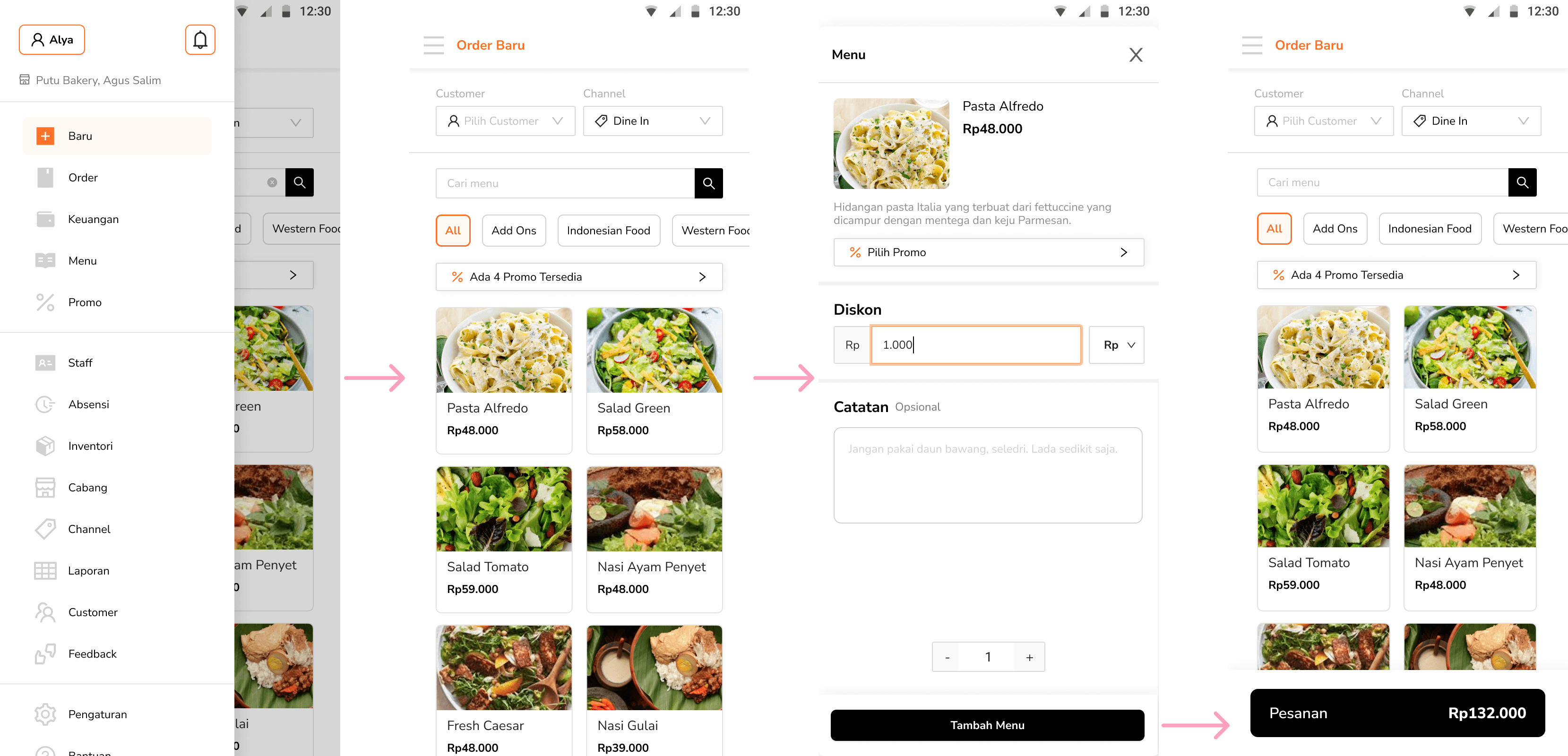 The Order Baru (new order) menu sits at the top of the navigation bar, since it’s likely the most frequently used feature. Items are added to the total order via a pop-up, maintaining a seamless and focused workflow.
