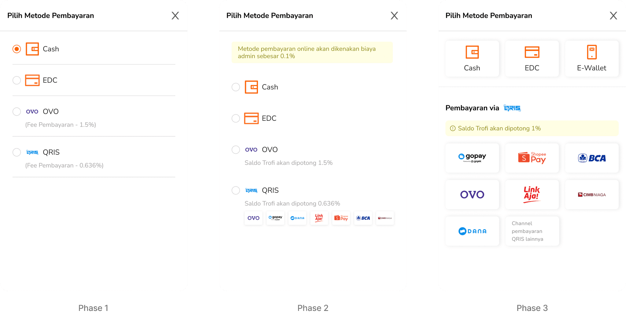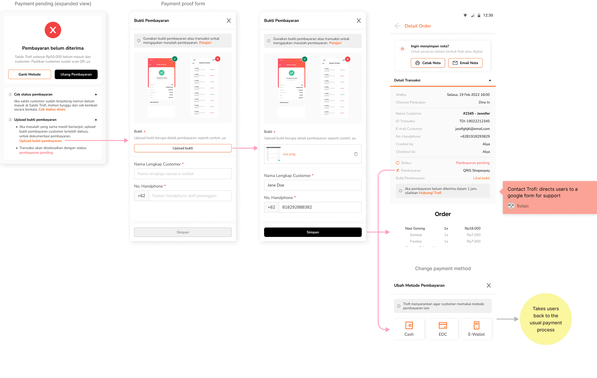 In the red flow, if the payment didn’t go through to Saldo Trofi (Trofi Balance), I also added an option for users to upload proof of payment so the Trofi team could help resolve the issue. Other than that, users can also change the payment method if the problem persists.