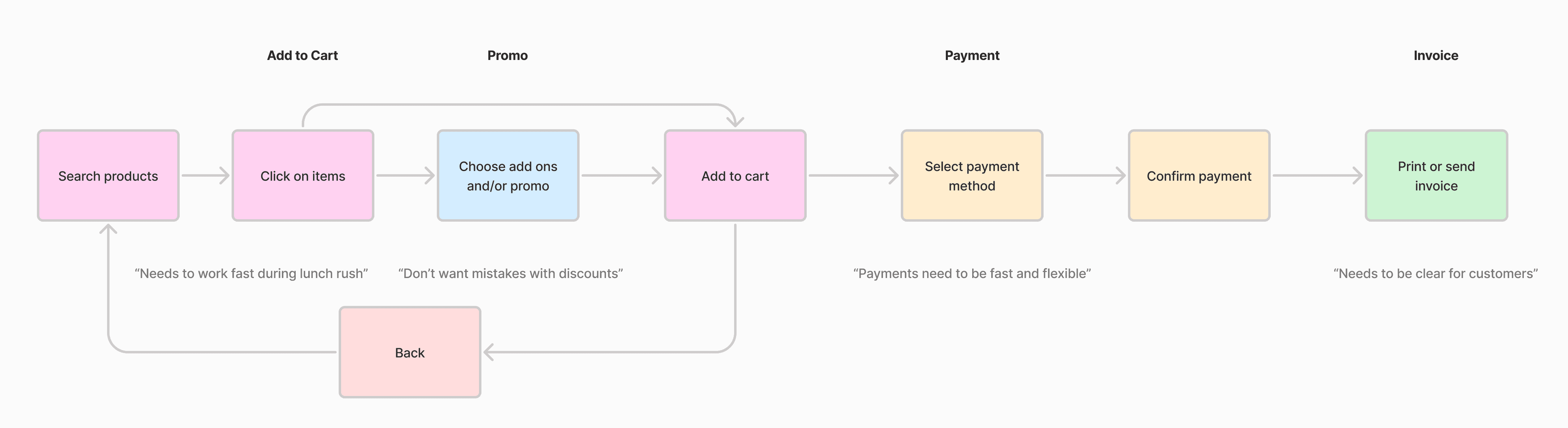 At peak times, the cashier might be juggling multiple orders, answering quick questions from the kitchen, and handling impatient customers all at once. In these moments, even one extra step in the flow can feel like a burden. The challenge is to design a system that responds instantly and reduces decision-making, so staff can focus on service instead of fighting the interface.