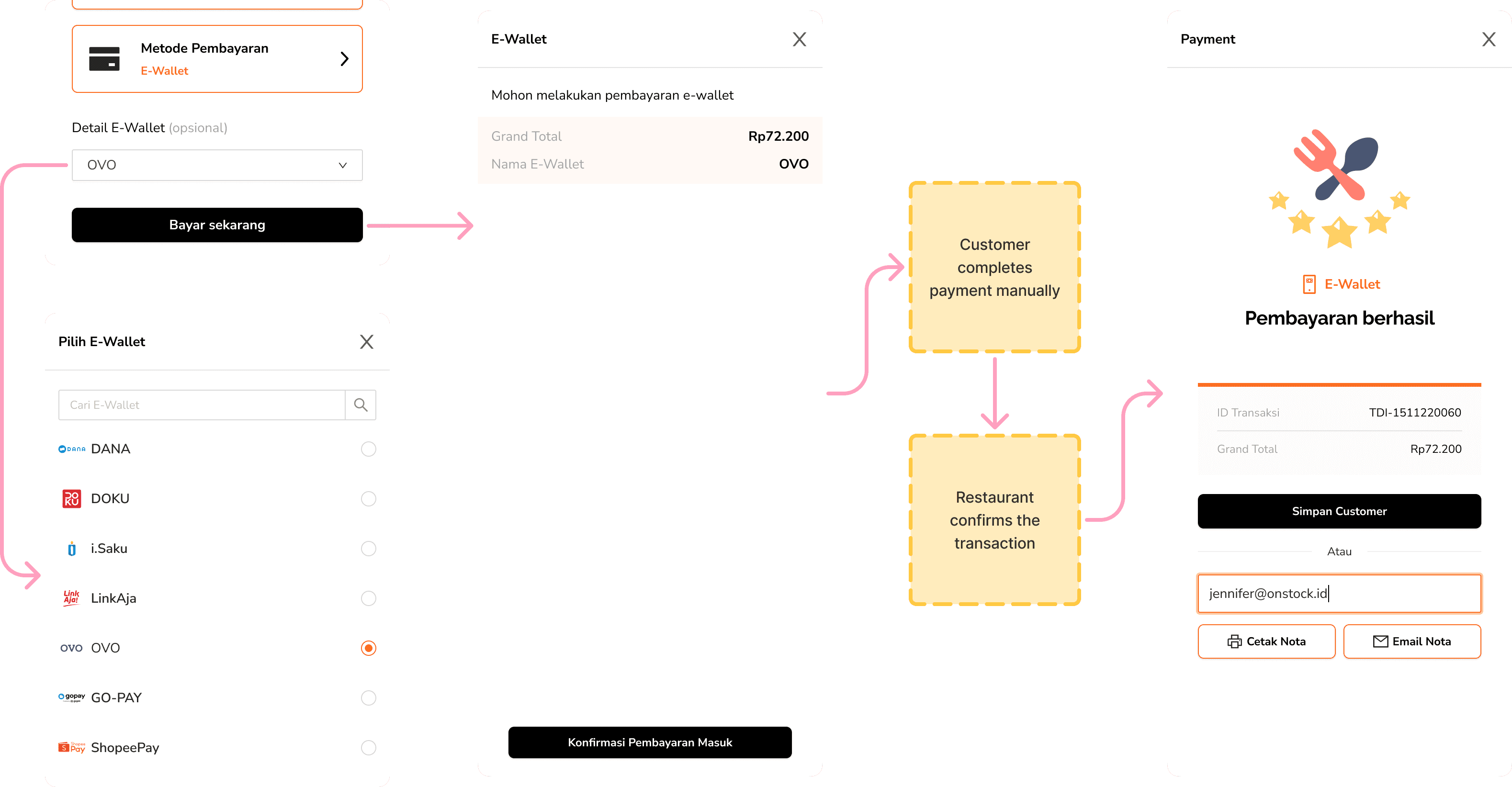 For e-wallet payments, restaurant staff can select which specific e-wallet the customer wants to use. After making their choice, the customer completes the payment manually while the restaurant confirms the transaction on their side.