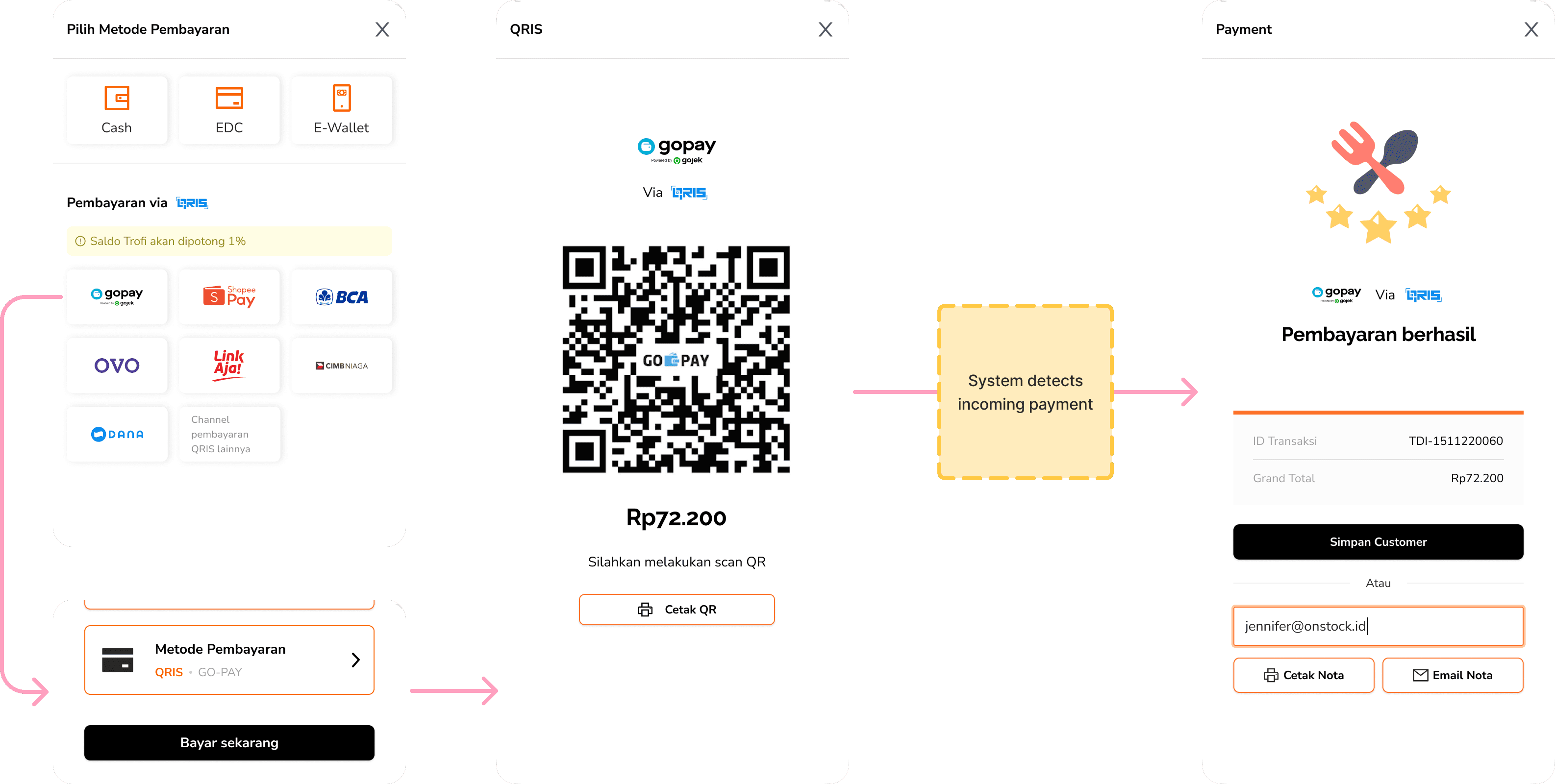 Payments via QRIS work in a similar way, where the staff selects the payment channel before proceeding. However, unlike manual e-wallet payments, QRIS transactions can be detected automatically once the payment goes through, reducing the chance of human error and speeding up the process.