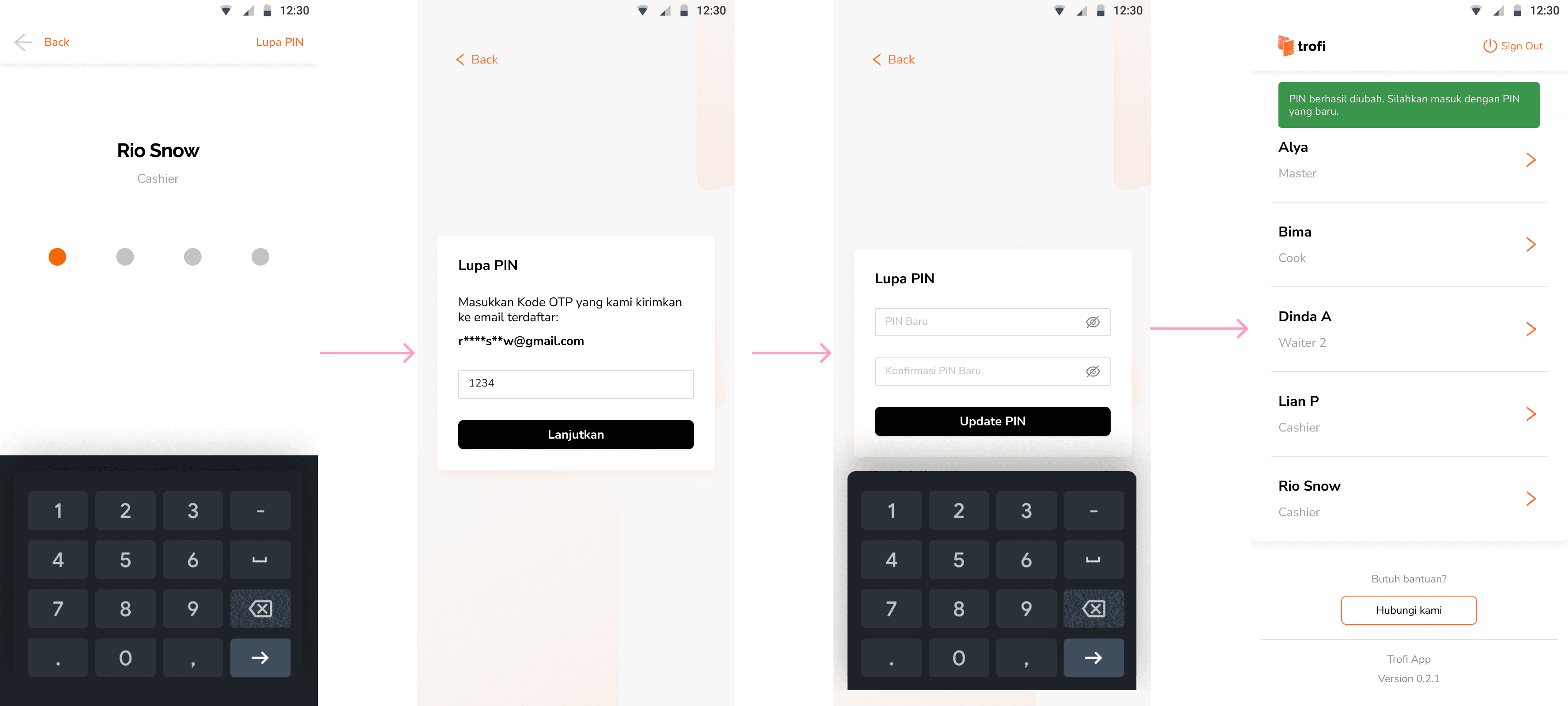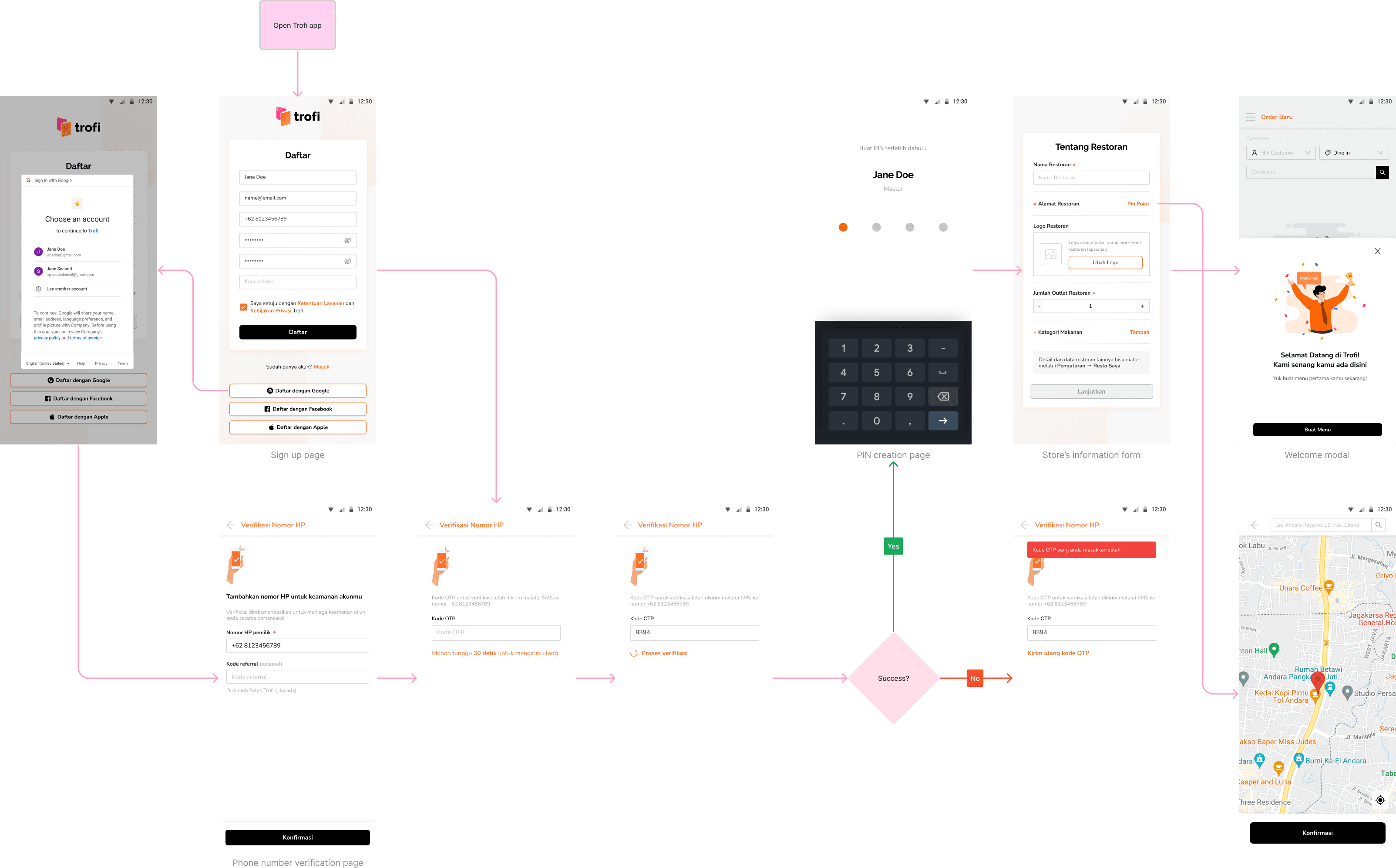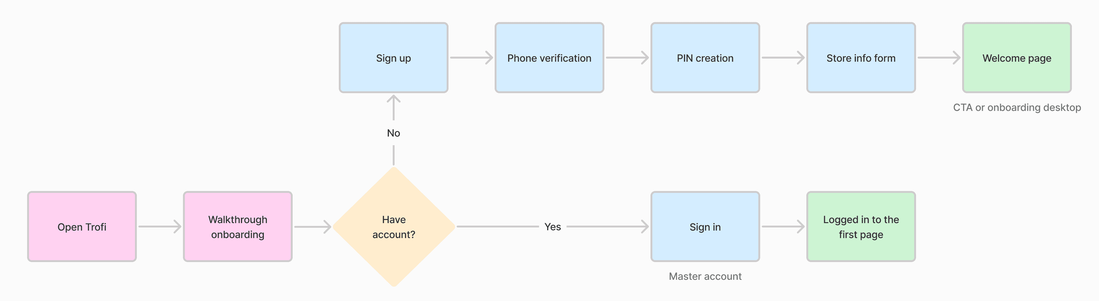 Starting from onboarding, the design had to account for different entry points (sign up, sign in, or recovery). Once inside, the outlet iteration added another layer: selecting the right staff name, entering a PIN, and picking the assigned outlet. Visualizing this flow as a whole helped keep things consistent.