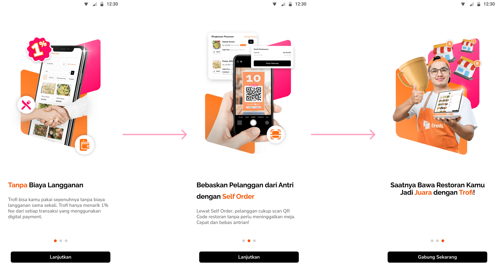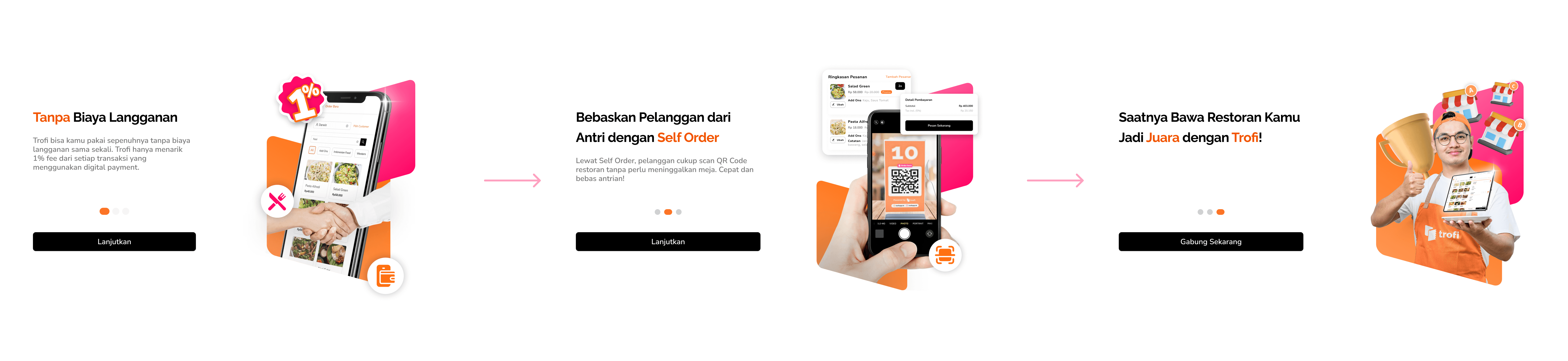 On mobile and tablet, the onboarding sequence consists of a short three slides that act as an opening handshake with the user. These slides present Trofi’s key benefits and core POS capabilities. Unlike longer tutorials, this version is concise and cannot be skipped.