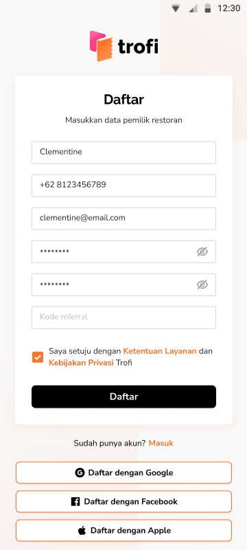 The sign-up flow in Trofi is designed to establish the account owner as the “Master” of the store, ensuring all store's data originates from a verified and secure source. The process combines simple form entry, social integrations, and initial business setup to get users ready for their first transactions.
