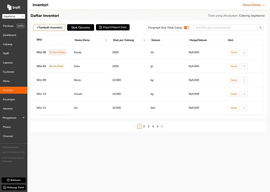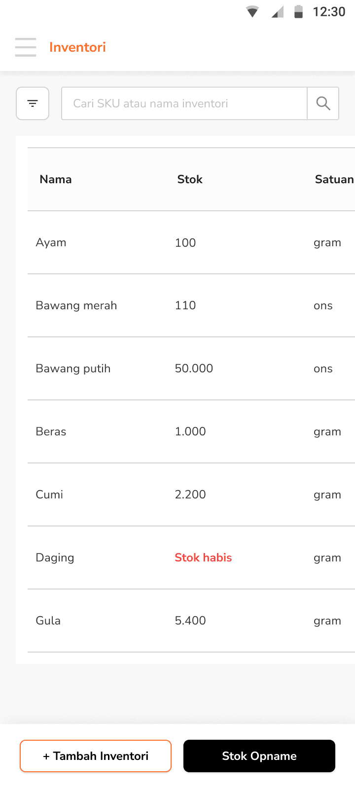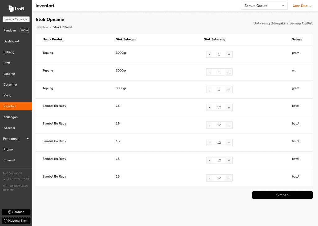 Stock Opname is where digital records meet physical reality. The page lists all inventory items in one view along with their current system-recorded stock and a field for entering the actual counted stock.