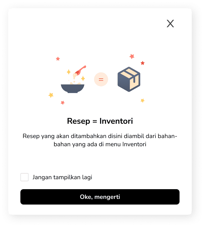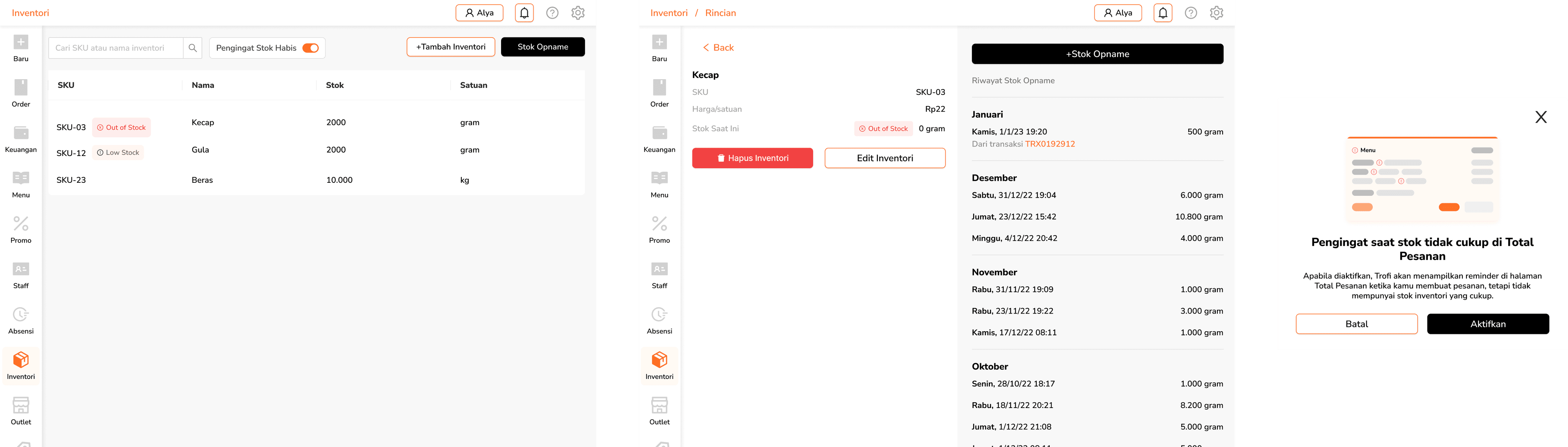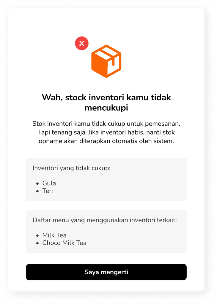 The system keeps track of inventory usage in the background. When a user adds a menu item to the cart, a popup will appear if one or more of the linked ingredients don’t have enough stock. The popup informs staff that the inventory isn’t sufficient to fulfill the order. But the system will auto-apply stock opname in the backend.