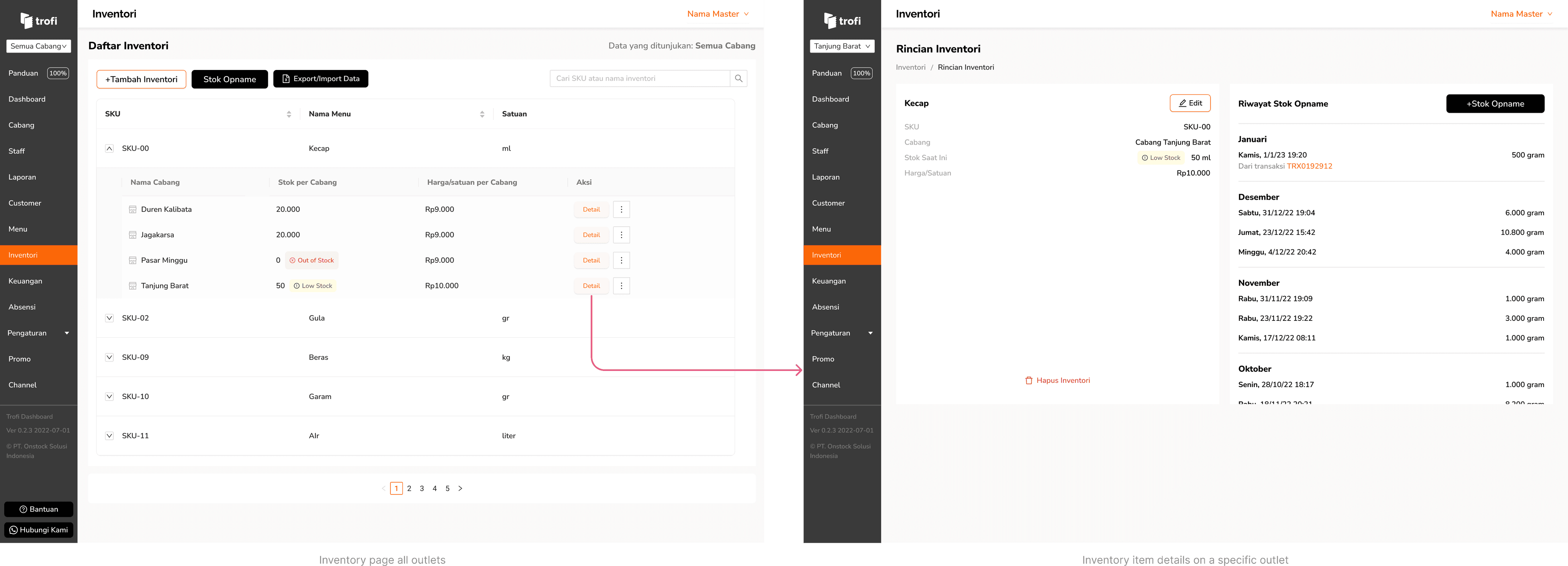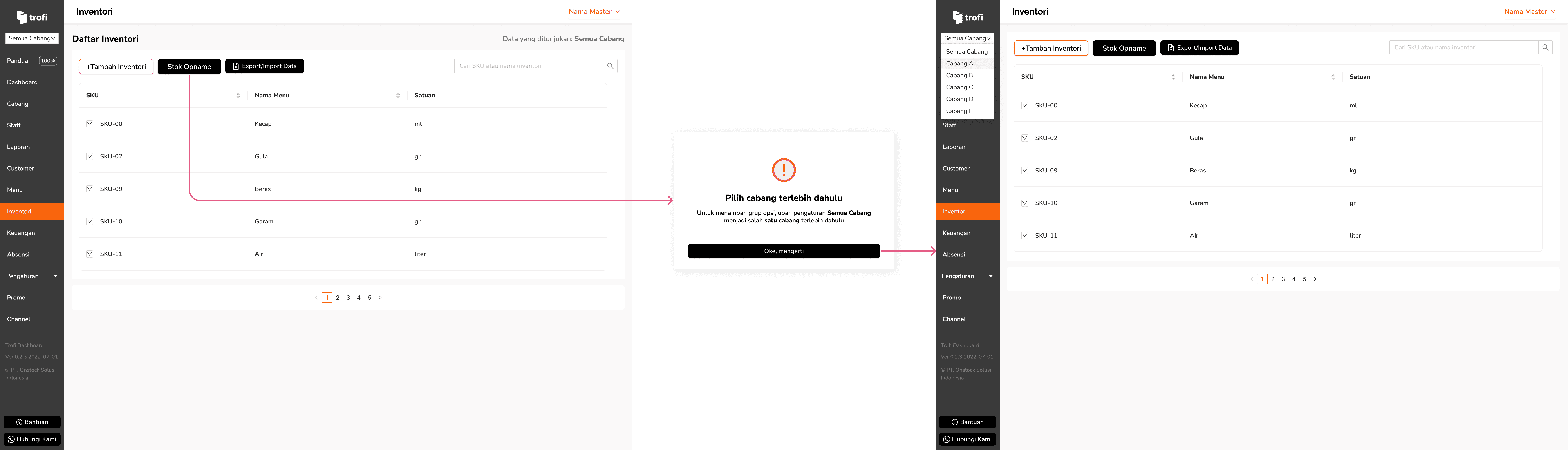 Small touches were also added along the way. Changing the outlet from an inventory detail page takes users back to the main list, pre-filtered for the chosen outlet. This prevents confusion about which outlet’s data is being viewed and keeps the context intact without forcing a manual reset. Even in quick navigations, the interface subtly confirms the outlet change through updated headers and table content, so users instantly know they’re in the right place without extra clicks or page reloads.