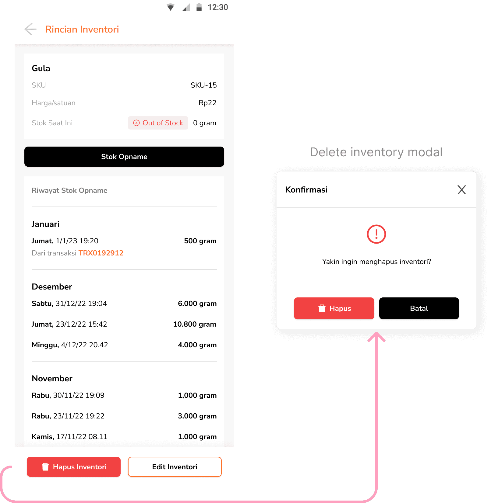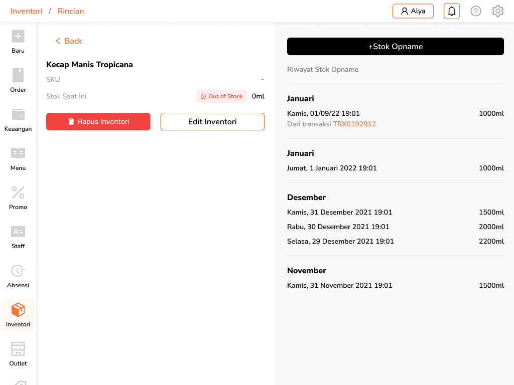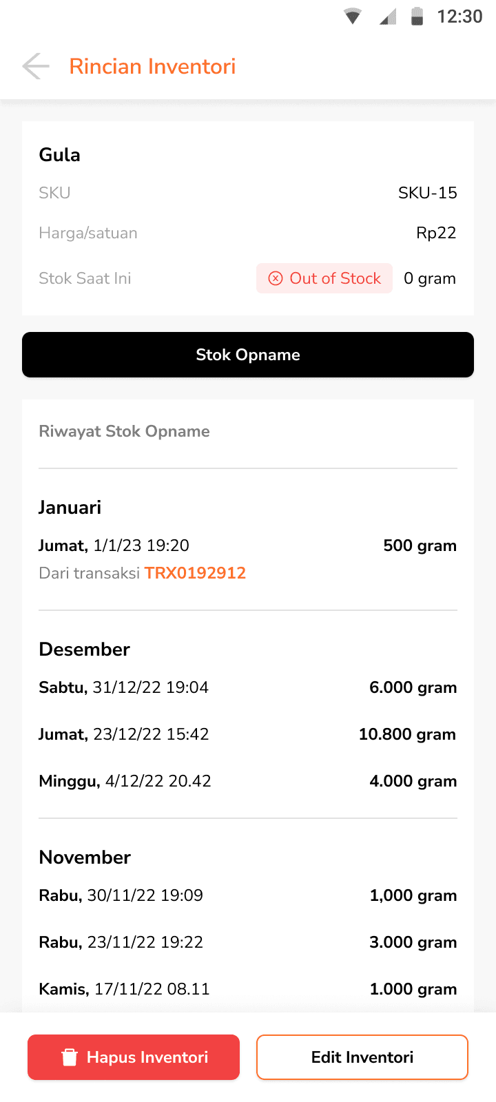 Tapping on an inventory item opens its detail page, showing all essential info at a glance: item name, stock level, unit, price per unit, and system-generated SKU. The page also displays the stock opname history for that item, helping track past adjustments. From here, staff can update item details or delete the inventory if it's no longer needed.