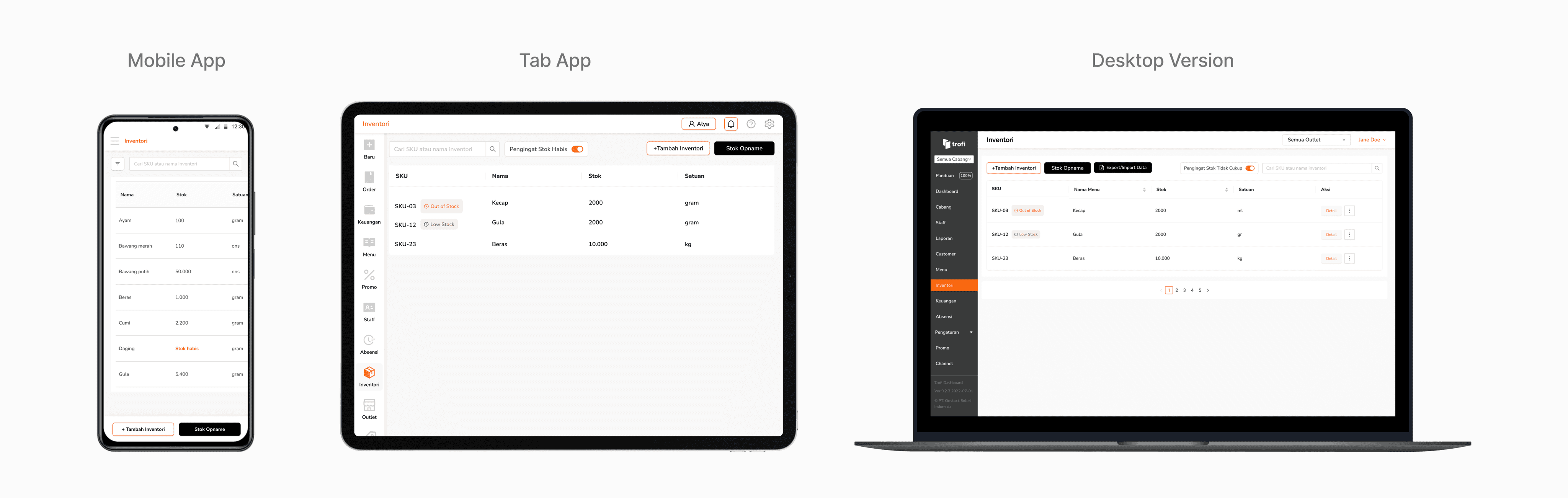 Inventory supports tablet and desktop screens using the overall same flow as mobile. The layout adapts to larger screen sizes, providing more space to view stock lists, access details, and manage multiple items with fewer scrolls or taps. This setup allows staff to switch devices seamlessly, while keeping all interactions familiar and efficient.
