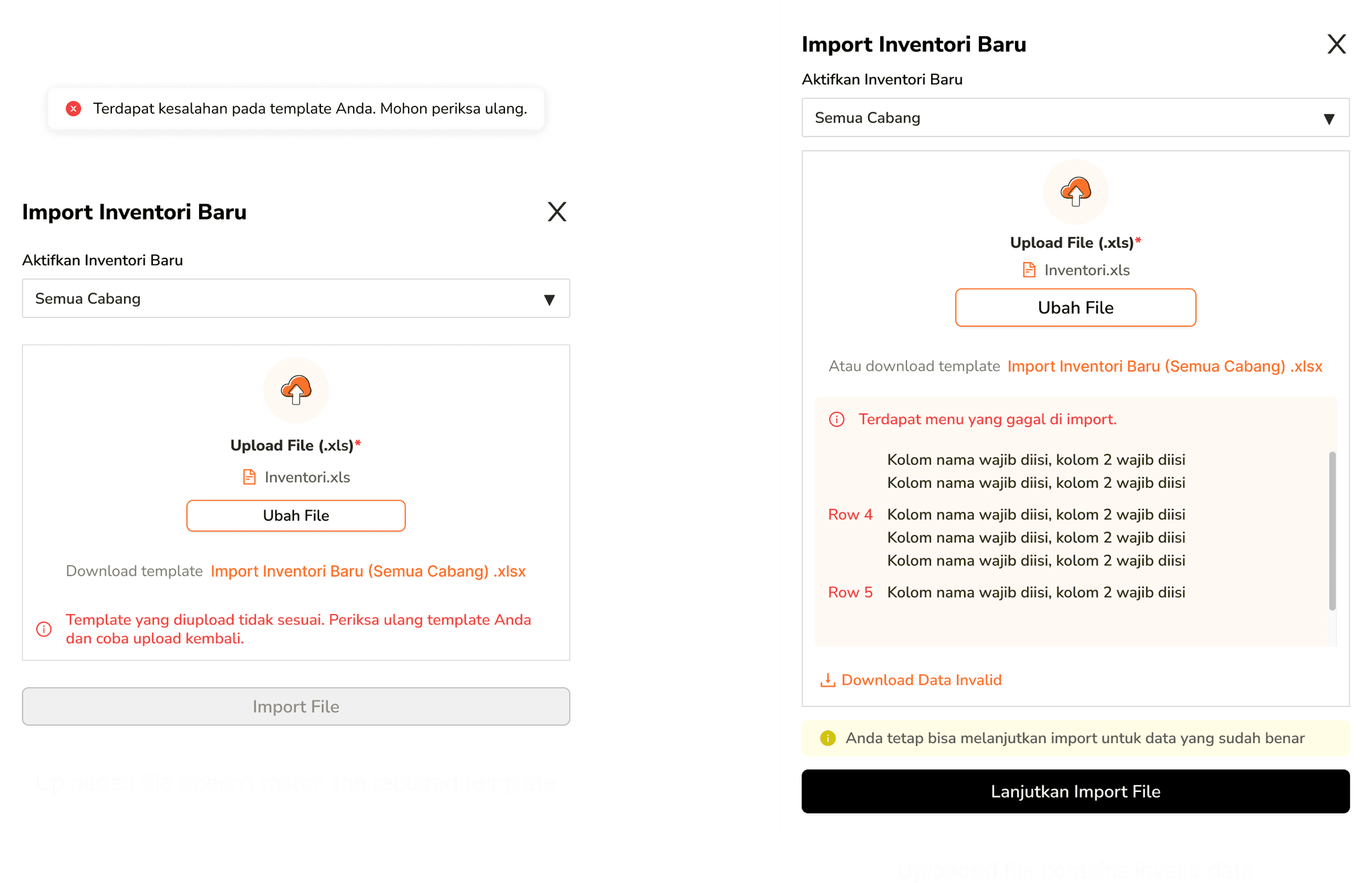 The same error handling applies to both bulk inventory import and bulk stock opname import. There are two main error cases: