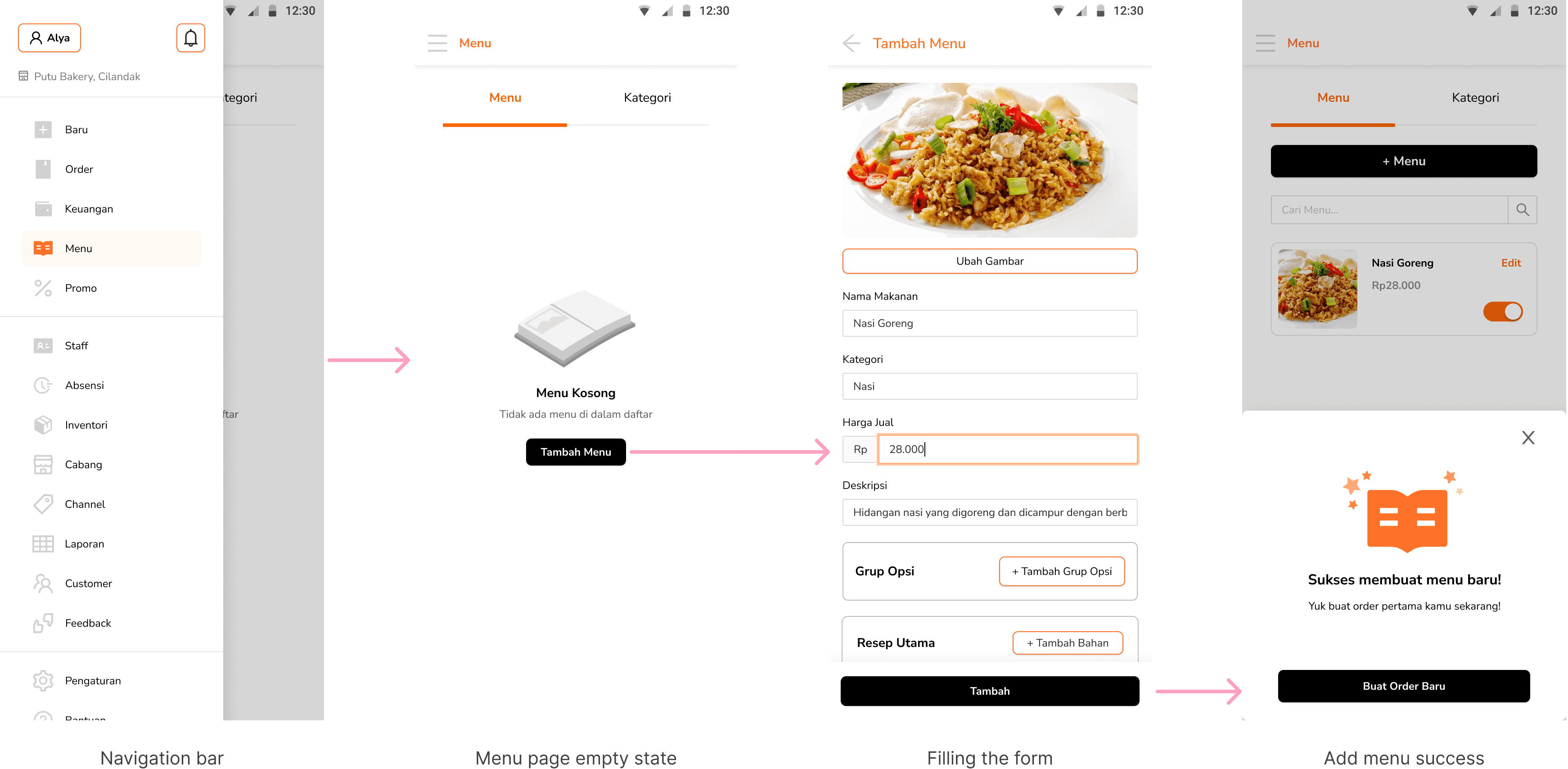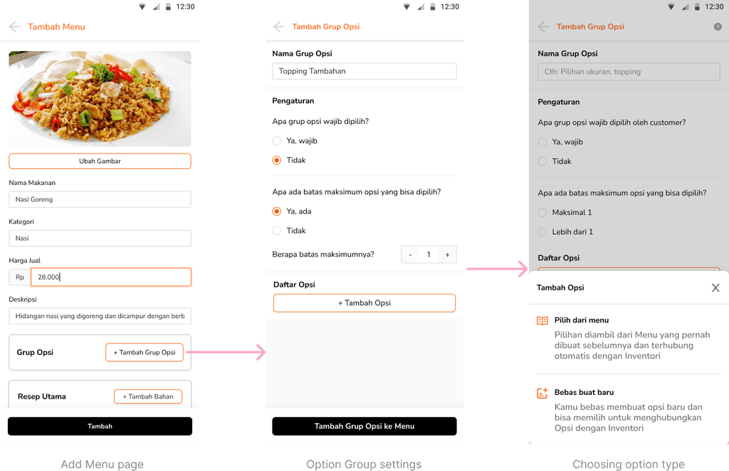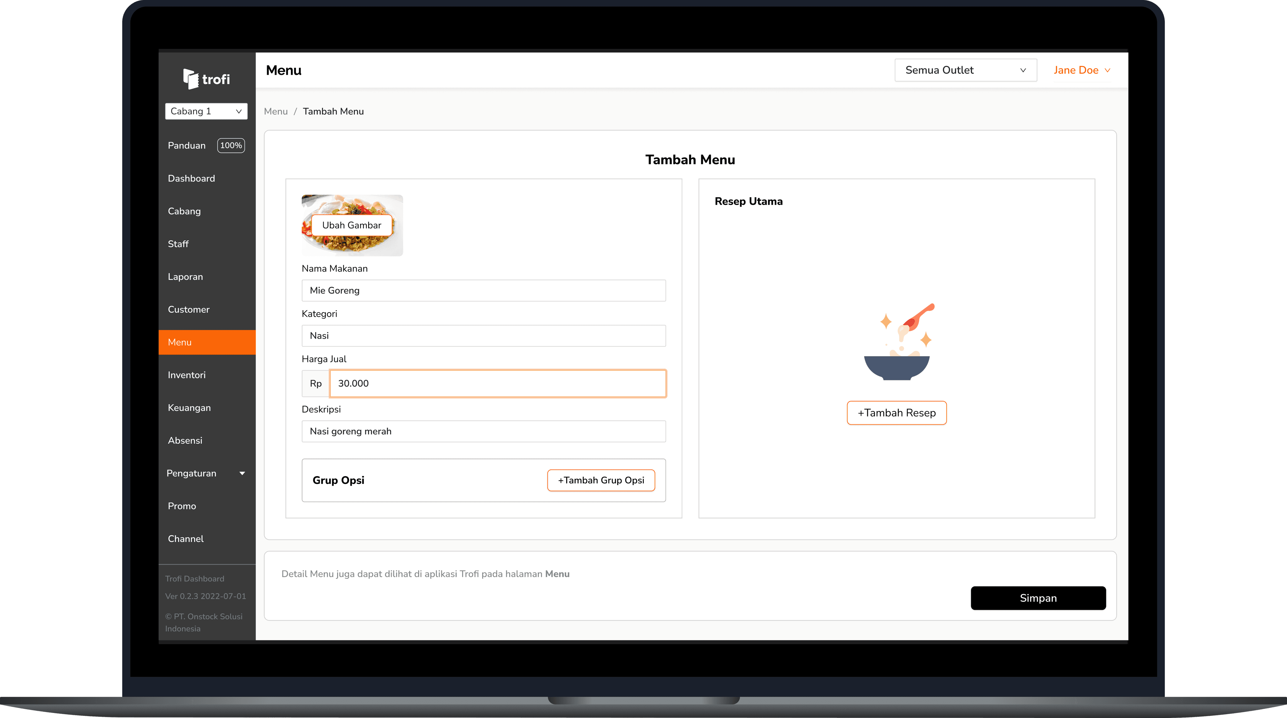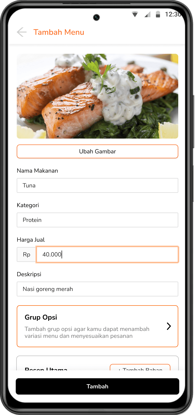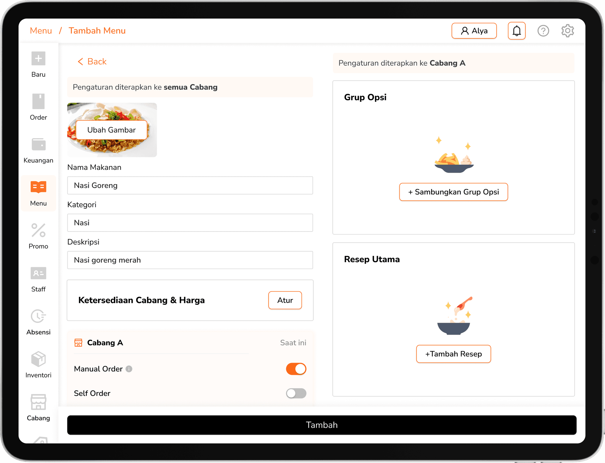 On the Add Menu page, users are required to fill in essential fields such as the menu name, price, and category. They can also optionally assign Option Groups (which are additional variants customers can choose from) or connect the menu to a recipe that pulls from inventory.