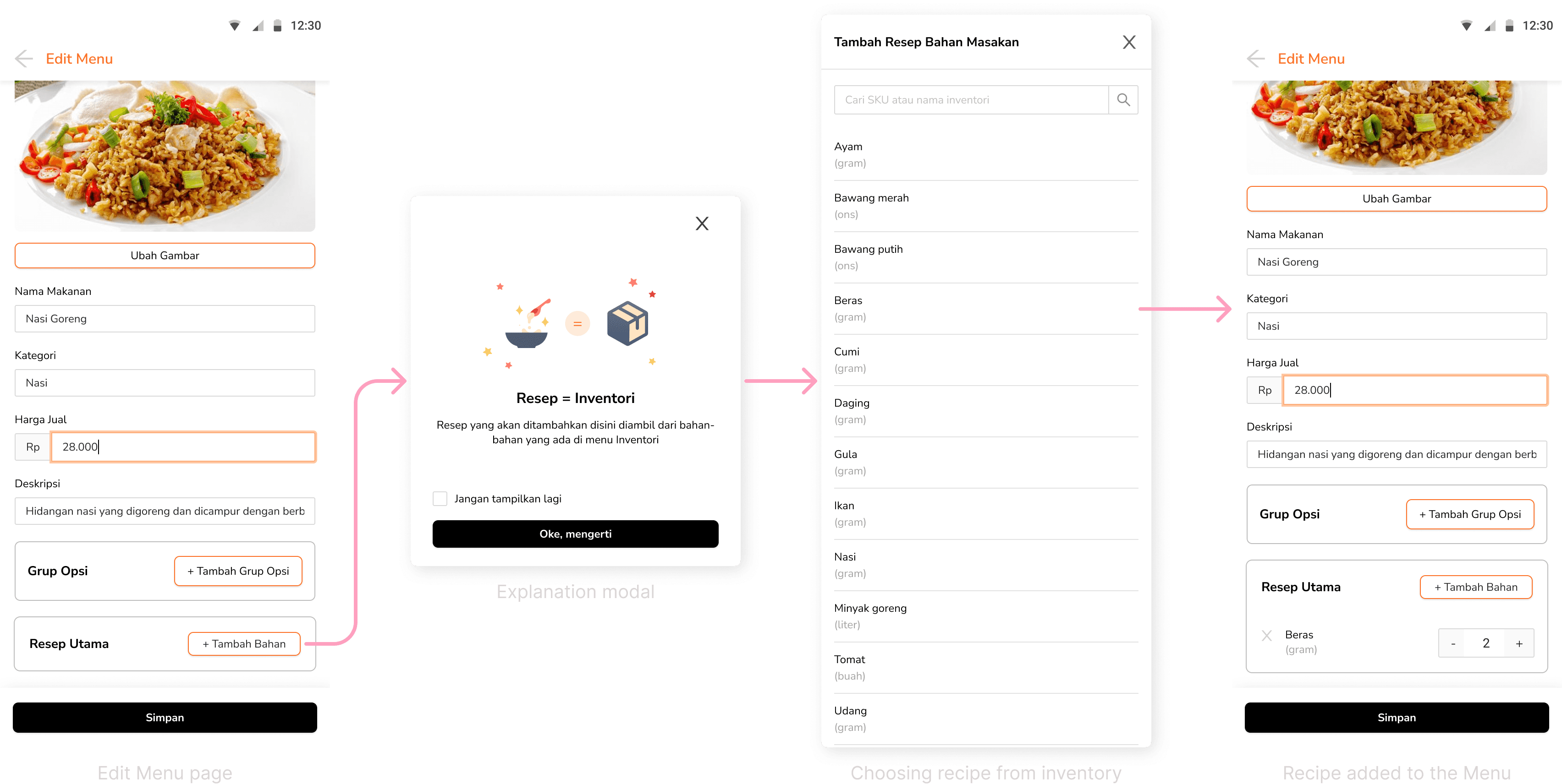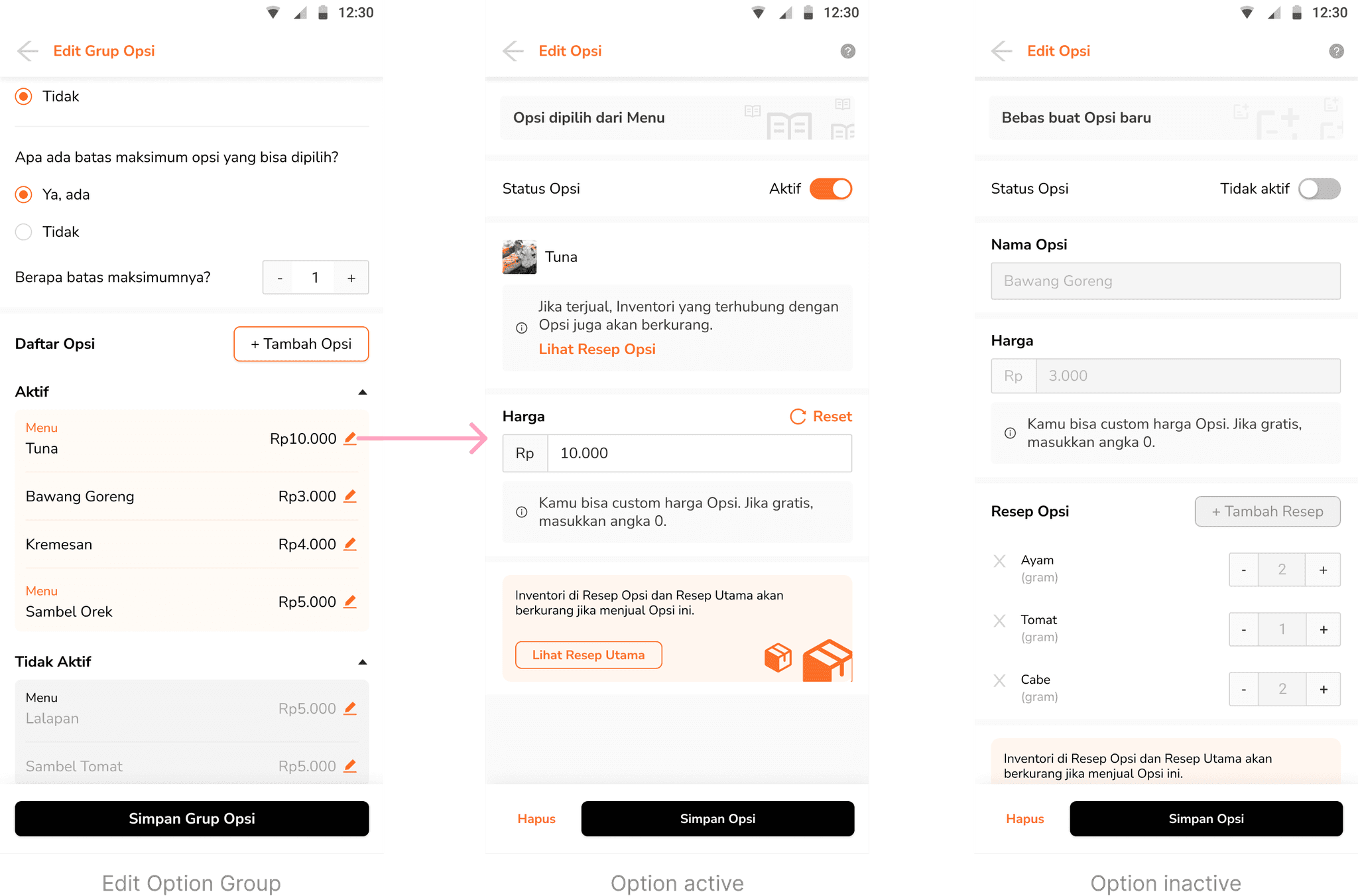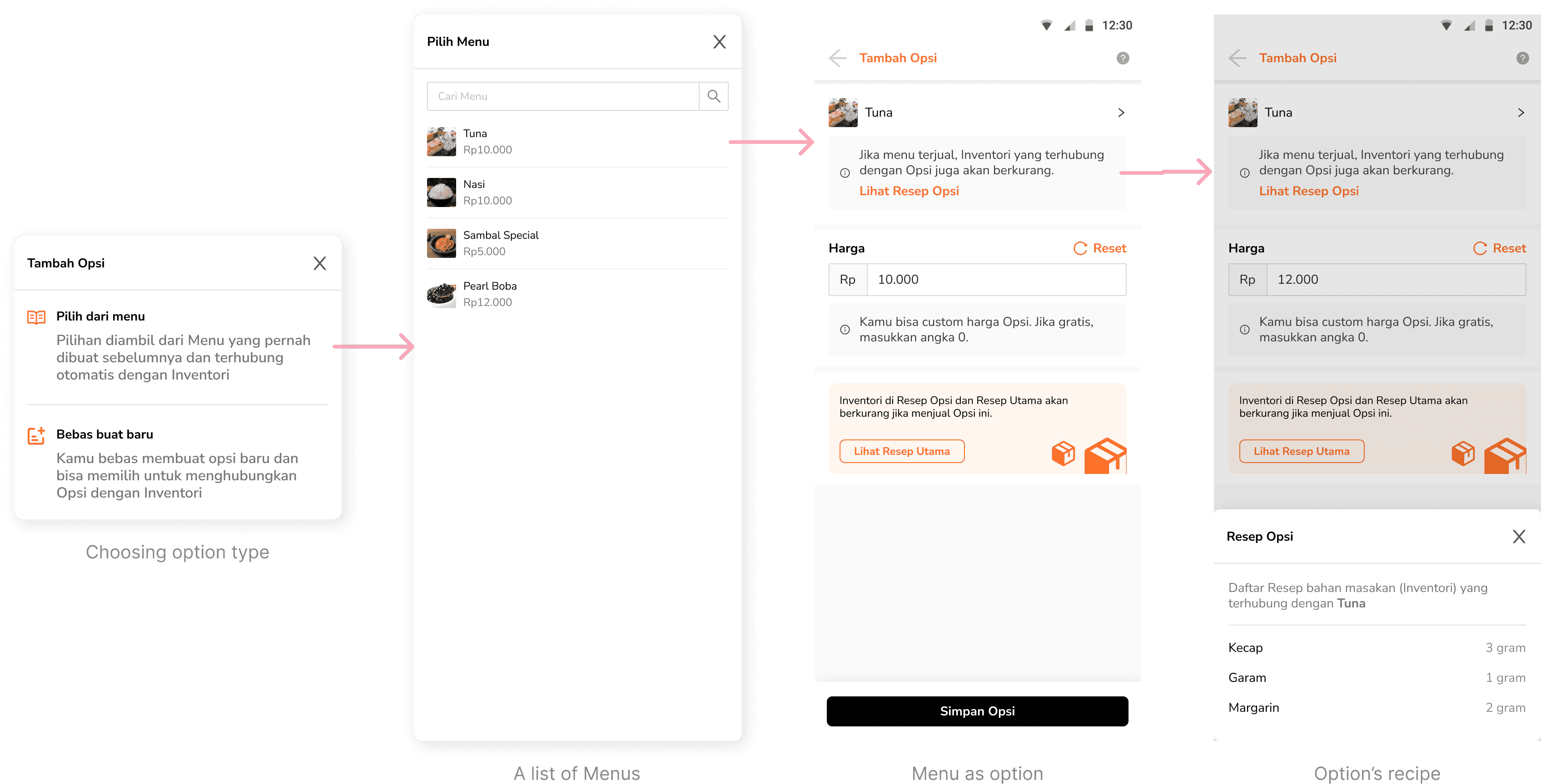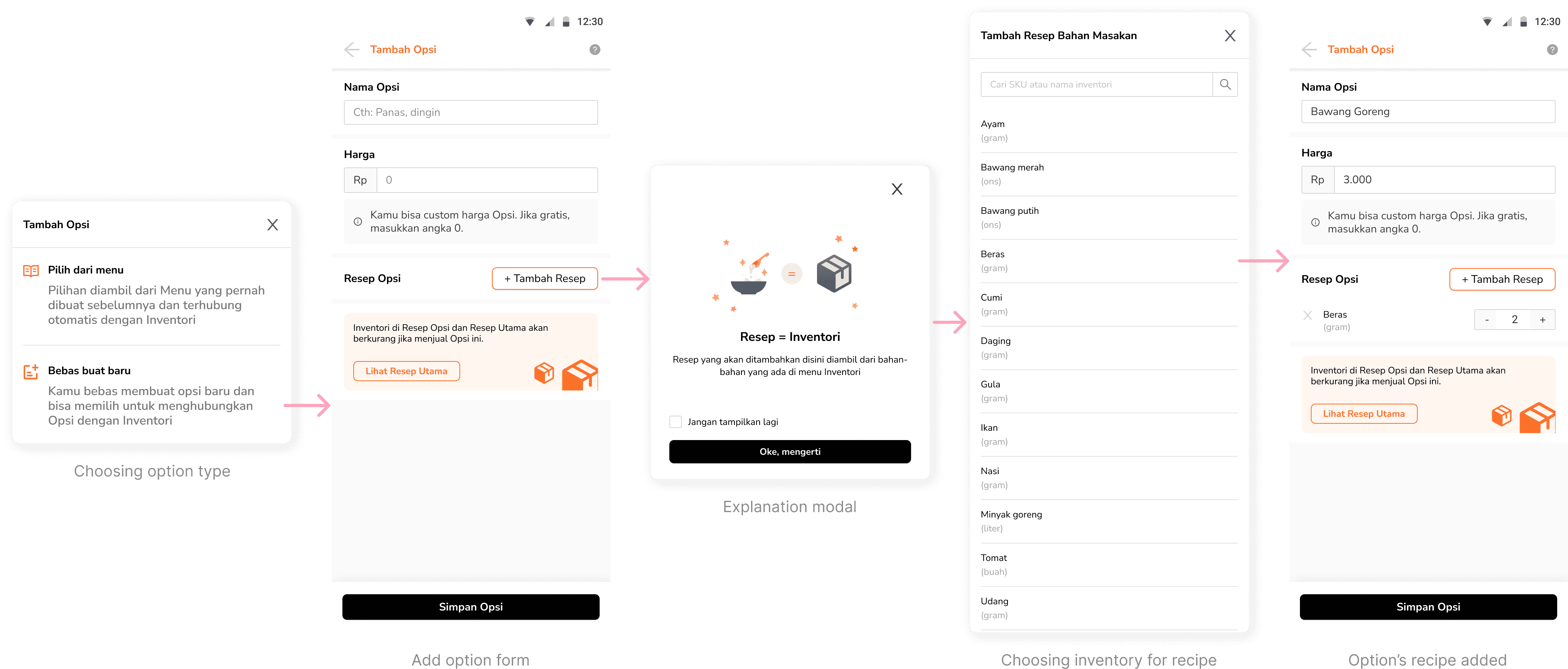 In addition to option recipes, there's also a main recipe—this refers to the inventory linked directly to the main menu item. When a menu is sold, both the option and main recipe inventories are reduced accordingly.