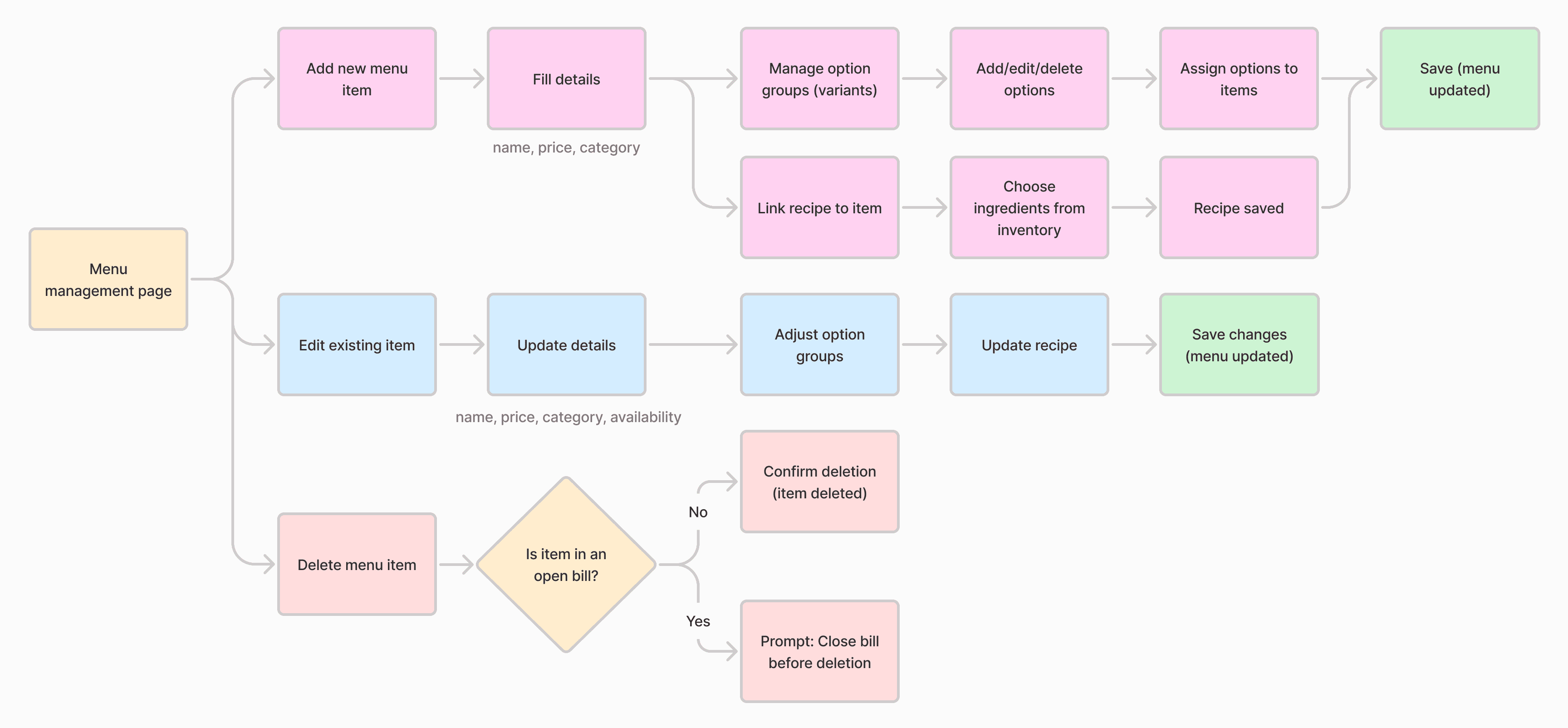 Creating a menu is the first step in getting any restaurant system up and running. The flow covers how users add new items, set their prices, assign categories, and organize everything in a way that’s clear and easy to manage.