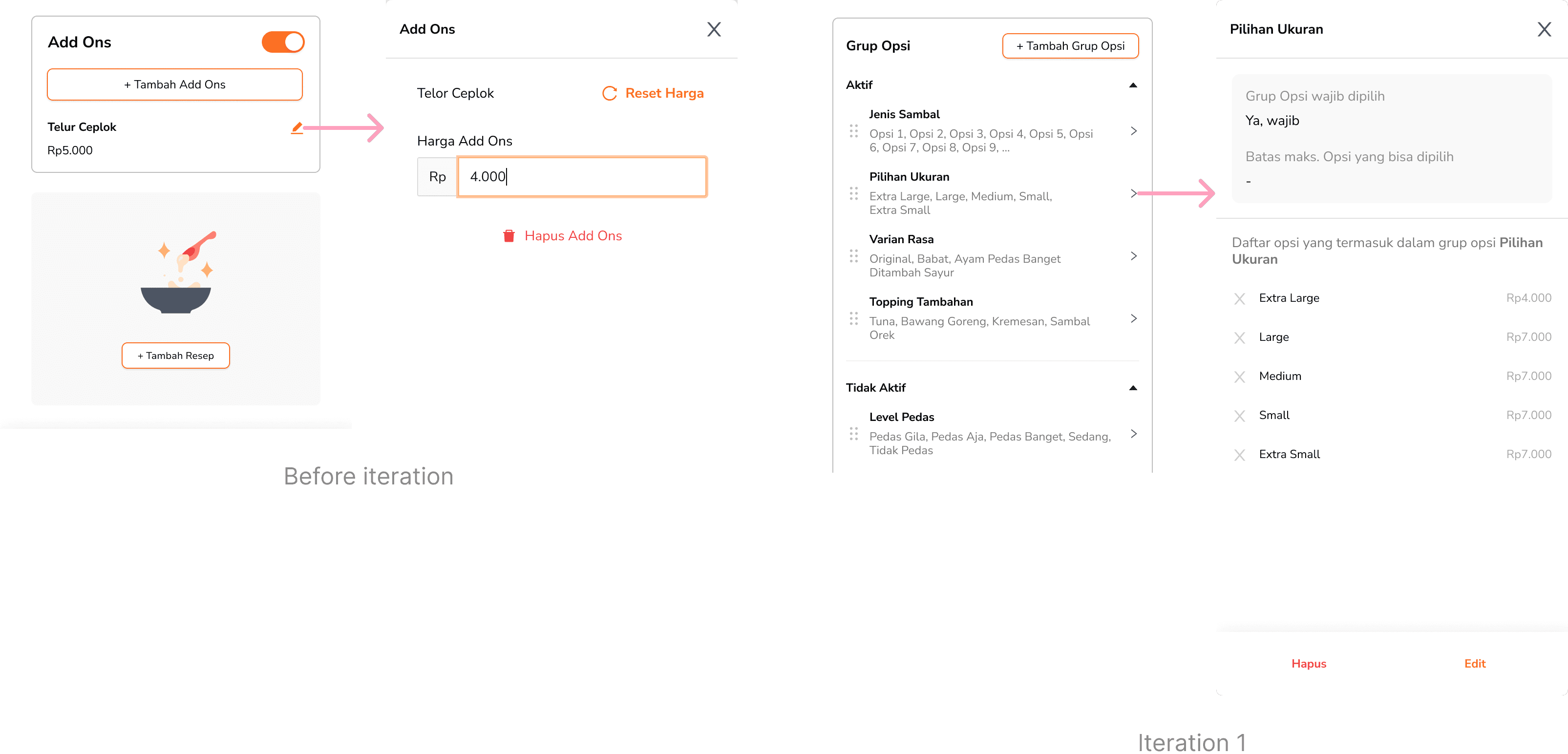 As Option Groups were introduced later through product iterations, several related screens required adjustments and the most noticeable changes happened in the Order flow. This includes refining how users add items to cart, view order details, and checkout experience.