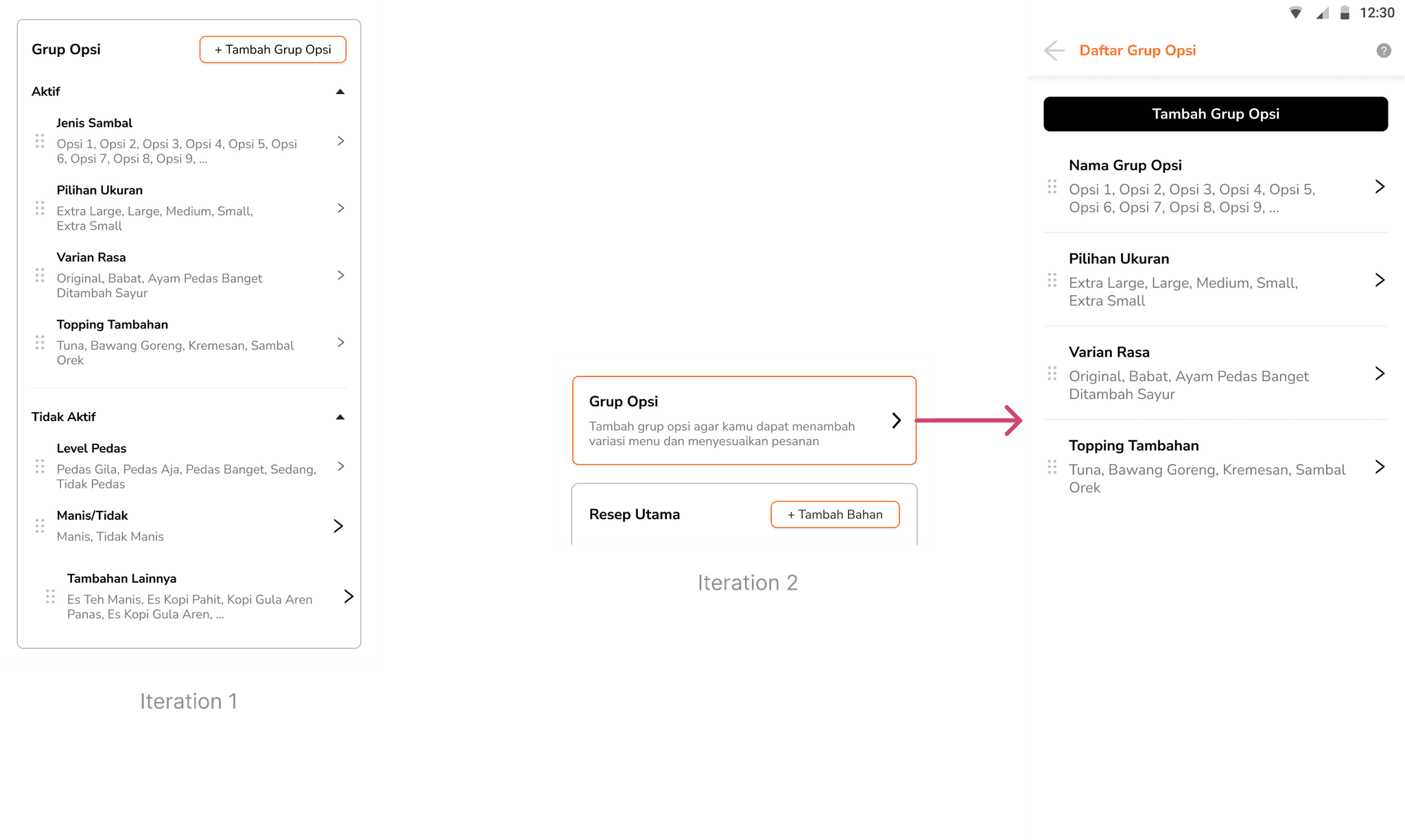 Placing Option Groups as a standalone tab—alongside Menu and Category—would make it easier to revisit, reconnect, or repurpose them later. Grouping them this way also aligns with how users mentally organize core menu components.