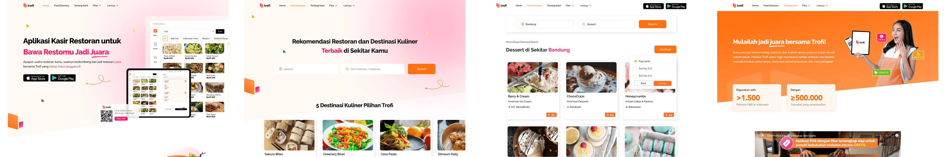 Each screen is tailored to its device: mobile and tablet generally share the same flow, while desktop introduces a dashboard layout. Beyond the POS, I also worked on Trofi’s back office design and its company profile website.